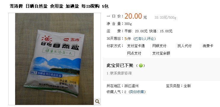 某淘宝店卖出了一包盐20块钱的天价!每个ID限购5包,竟然还卖到断货下架了!
