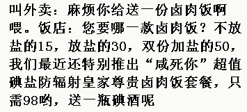 叫外卖:麻烦你给送一份卤肉饭啊喂。饭店:您要哪一款卤肉饭?不放盐的15,放盐的30,双份加盐的50,我们最近还特别推出“咸死你”超值碘盐防辐射皇家尊贵卤肉饭套餐,只需98哟,送一瓶碘酒呢