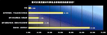 市民对生鲜类食品提出更高要求。不少市民认为超市现有的生鲜食品保鲜和卫生状况一般,接近84%的受访市民表示愿意多花钱购买绿色食品,尤其是在货源正规、质量有保证的情况下,接近58%的受访市民可以接受较高的价格。