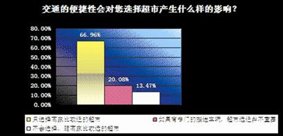 调查数据显示,有接近67%的市民只选择离家近的超市,接近58%的市民表示会去某家超市购物的原因是“交通方便,离家很近”,“就近原则”依然对超市销售起着重要影响。