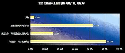 对于超市的促销,超过半数的受访市民会因为价格便宜而选择购买,正好有此类需求的市民也会选择促销品,因为提前尝试新产品而选择促销商品的,只占受访市民的约15%。这显示超市的价格促销效果最大。