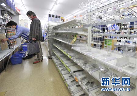 3月24日,在日本宫城县首府仙台市,一家超市的方便食品货架空空如也。