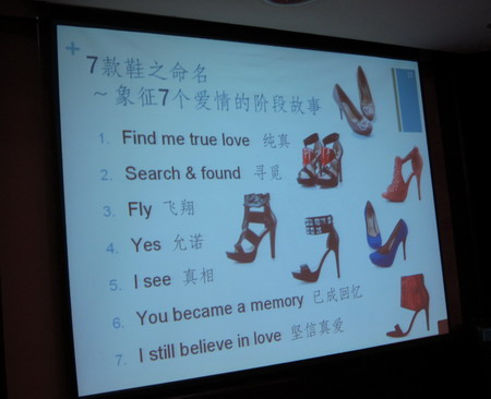 为了让康永更清楚,真的合乎设计师的身份,康永和我谈合作完之后,11月的时候他就自己跑到工厂,他提了这个要求,他跑到工厂和设计师开会,我们也把这个镜头留下了,因为这是我的幕后花序。你就会发现康永那个时候没有什么打扮,戴了一个帽子就跑到东莞的工厂,和国际级小的设计师,有一票外国人算是高级设计师下面第二级的设计师,和他们开会讨论那个鞋子。如果眼睛尖一点会发现后面贴的图就是目前发展出来鞋子的原型,当初是先提出概念,设计师画图,到工厂之后把所有的皮料做讨论,然后在那一刻定下了商品的概念。那天他和我们开了一整天的会,他把所有鞋子放在一起的时候,他把设计概念串在一起,他做出了一个概念,“给每一个值得宠爱的女人”,你知道女人都希望被宠爱,女人都很感性,女人都希望被爱,如果微博里谈到爱情的话,转发率第一名。因为是七款鞋,他就设计了7个浪漫的爱情故事,他每一个女人这一生爱情阶段慢慢呈现,每一个女人都可以选择适合自己心情,爱情观点的那一双鞋。除了这七个爱情故事之外,蔡康永在每一双鞋子里面放了一个文字符号,每一个文字符号就可以找,他放的文字符号在什么地方,他也亲自为每一款鞋写了爱情箴言。七款鞋的命名,象征7个爱情的阶段故事,纯真、寻觅、飞翔、允诺、真相、已成回忆、坚信珍爱。最近林熙蕾结婚的时候就是穿着YES。