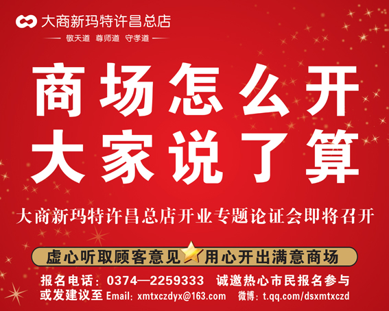 新玛特许昌总店以这样的形式召集民意代表参加论证会在我市尚属首次。本次会议将邀请政府相关部门、社会团体、专家教授、供应商及消费者代表共同参与,面对面的讨论未来商场的建设与发展,这是一个商业企业向社会敞开心扉的一种姿态,它将有利于许昌商业的进程。希望关心未来许昌发展的社会各界人士踊跃报名,本次活动的主办方将从报名的市民中抽取幸运人士作为代表前来参会会,报名电话:0374-2259333。本次活动还设置有奖征稿,针对许昌商业发展及新玛特许昌总店开业广泛征集各类意见和建议,开通E-mal:xmtxczdyx@163.com,微博:http://t.qq.com/dsxmtxczd,热心市民可将自己的建议予以发表,并可通过论坛发帖积极参与,主办方也将筛选优秀建议给予奖励,一经采纳再给予重奖。