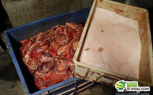 4月26日下午,白云区质监部门人员对该作坊进行查处。南方日报记者目击该作坊腐烂发黑的猪肉随处可见,而据现场执法人员初步估计,该非法加工窝点现存的“问题肉”有近3吨。