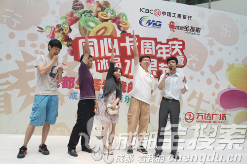 昨日上午10点30分,同心卡周年庆在成都万达广场中庭举行,与周年庆同时开始的冰品水果节吸引了大量的同心卡粉丝。