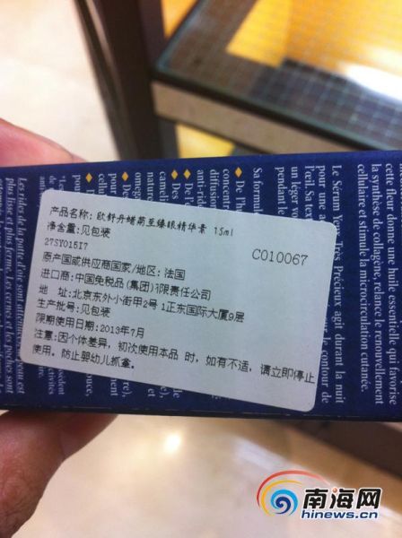 来自上海的范小姐4月28号搭机前往海南旅游,此行最吸引她的,就是刚刚开放的离岛免税购物。为了这趟购物之旅,范小姐根据之前自己做过的功课,选购了一款标价260元的“欧舒丹乳母果油6件套”,5月1号回到上海,范小姐却发现那款欧舒丹的化妆品出现了问题。尽管产品外包装上中文标示的保质期是2013年7月,然而每个单件产品上原厂标示的有效时间却是今年的2月。换句话说,这些欧舒丹的化妆品,今年3月份就已经过期。在正规的免税店里为什么会出现过期产品?中免集团三亚免税店副总经理滕锐解释,一般来说,对于过期的货品,集团下架封存由海关查验后销毁处理,根据初步调查,有可能是部分销售人员培训不到位,造成了误贴标签的问题。