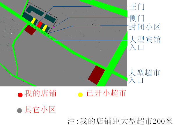 有利因素; 1 大型超市经营不太好,顾客不是很多. 2 左边的超市80平,由两个门面打通,所以有两个门,没有窗户,内部又间隔了厨房和卧室,实际营业面积65平.3 右边的超市40多平,一个门,没有窗户,也间隔了厨房和卧室,实际营业面积30平,4 我的店位于小区正门边上,有一个门和3个窗户,光线充足.