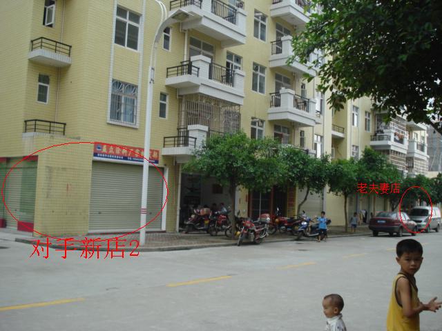 3,对手情况:新店1最近开张,生意好的很,经营生鲜果蔬,货堆如山,前后左右客源通吃,我的一半生意被它抢了。还有它屁股那间估计也要贴转让了。目前对面对手新店2正在装修准备开张,两间不是同一个老板。新店1面积100多租金1100。新店2面积60多租金700。本店面积45租金0,因为是自己的。