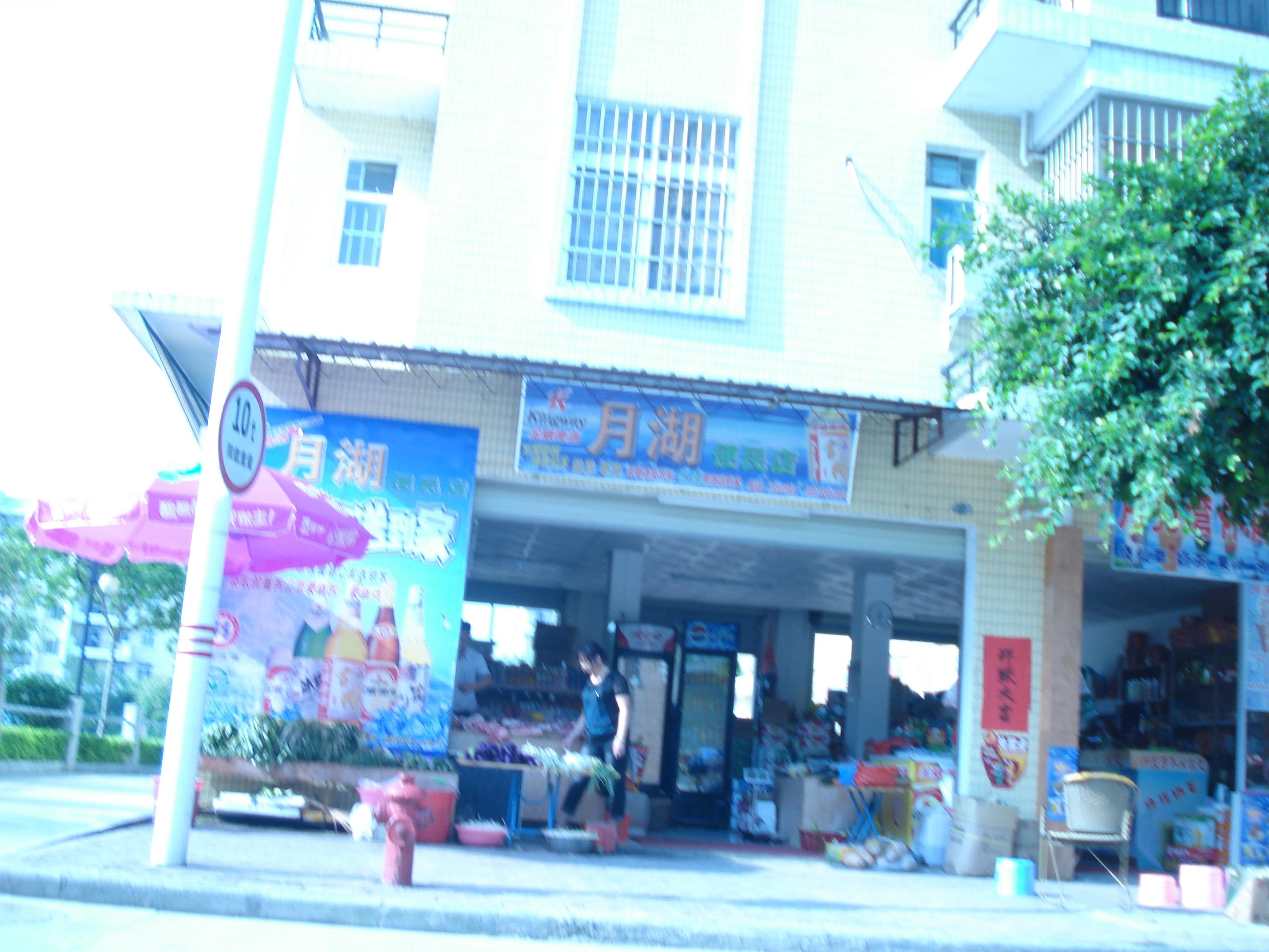 前后是贯通的,向湖那边用透明玻璃。后门正对另一间老超市,自从新店开了之后老超市生意差到地。
