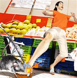 4月29日,杜佳佳来到人人乐双楠店负一层的苹果摊,准备买早市便宜的苹果。“有耗子!”人群中传来一声尖叫。一个黑影飞快地从佳佳脚上划过,接着消失到角落里。“哎呀,你脚被老鼠咬伤了。”旁边的太婆指着佳佳的右脚。佳佳低头一看,右脚背上有两道红色的印记。“老鼠好大哦,起码有20厘米长。”一时间,苹果摊闹开了锅。