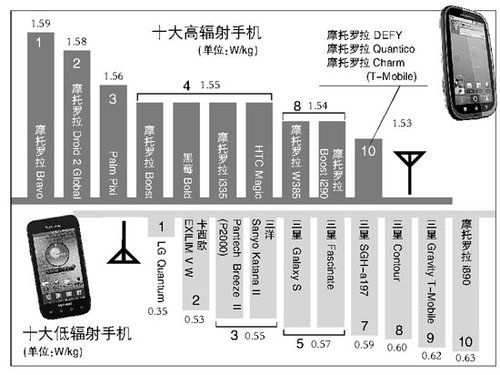 按照美国联邦通信委员会(FCC)规定的标准,手机辐射量是不得高于1.6 W/kg(瓦/千克)。按照这个标准,辐射量最小的十款手机中有5款为三星。而辐射量最大的十款手机中摩托罗拉手机占去7席。