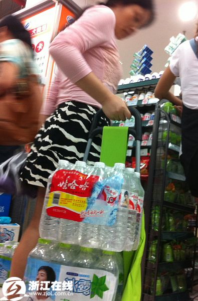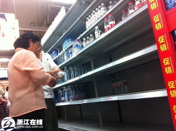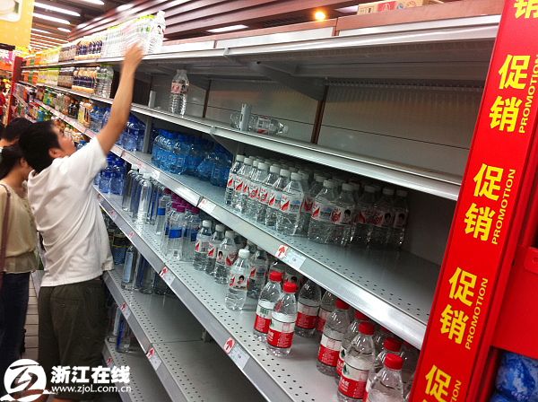 2011年6月6日,杭州城西一家大型超市里,存放大瓶矿泉水的货架已经被“清空”。受4日晚杭州水源地新安江苯酚污染,杭州市民开始赶赴超市抢购饮用水。截至记者发稿时,超市内仅存的矿泉水只有350ML以下容量的瓶装水和高档矿泉水。大多数进超市购物的市民,都采购了一定数量的瓶装矿泉水。