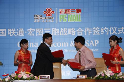 6月15日,中国联通与宏图三胞在南京绿地洲际酒店签署全业务战略合作协议,中国联通销售部总经理于英涛和宏图三胞总裁陈斌共同出席了当天的签字仪式。中国联通与宏图三胞的合作,是中国联通进行战略渠道布局的又一重大举措,必将深刻影响3G时代的产业链合作格局。