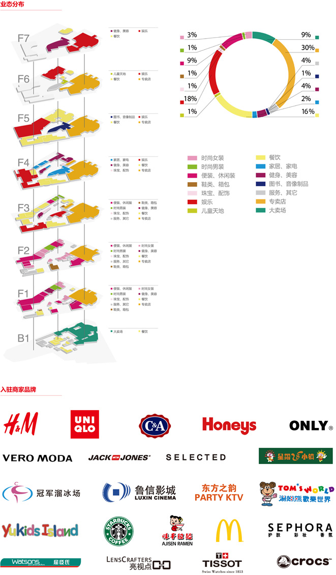 购物中心总建筑面积 145,100 m² 截止2011年2月出租率超过90%