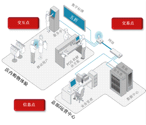 该方案以前端销售的POS平台为中心,加上互动展示平台,顾客可及时获得最新的导购信息,快速选择目标,实现高效结算;经营者通过这一解决方案,在第一时间获得不同店面的客户的消费消息,掌握产品的进销存动态,准确快速作出经营决策。