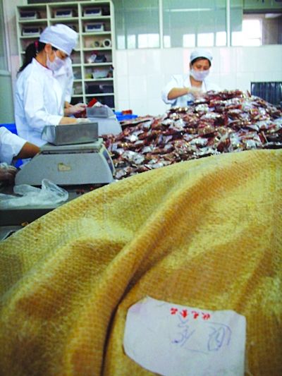 走进该食品生产加工厂区,只见在一片空地上,直接垒放着许多已经配好,即将运走的酱腌菜、泡菜之类的食品,不少食品上布满了灰尘,但在酱腌菜、泡菜之类的食品外包装上,有的产品名称被涂改,有的连生产日期都没有。进入该公司位于二楼一侧的包装车间,这里有工人正在加工“八宝饭”等食品,但加工好的不少成品竟被直接裸堆在生产车间的水泥地上,卫生状况令人堪忧。