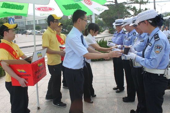 6月30日,潍坊银座购物中心和摸错门涮涮吧的工作人员为在烈日下坚守在工作岗位的交警同志送去了两箱酸梅汤等防暑降温物品,在炎炎的夏日里,为一线交警送去了一份清凉。 复制内容 责任编辑: 齐晓军