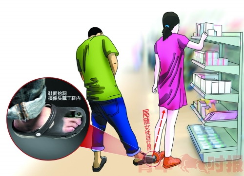 当他再一次紧紧跟在一名穿裙子的女孩子身后时,保安上前一查看,发现男子的凉鞋上居然装了一个微型的摄像头。