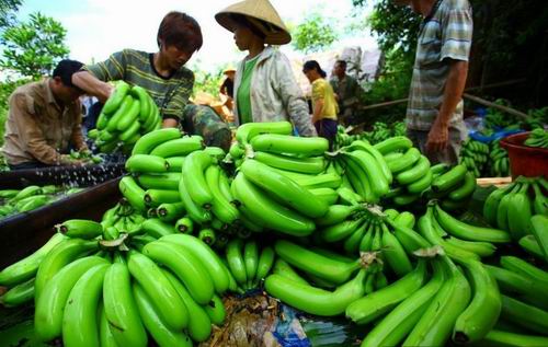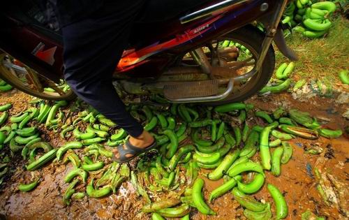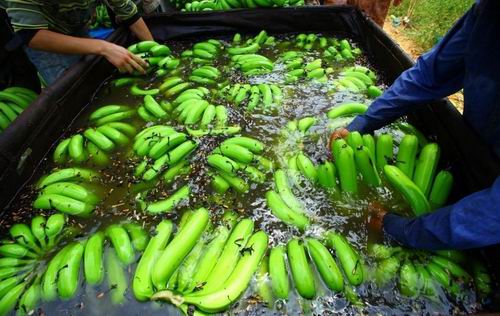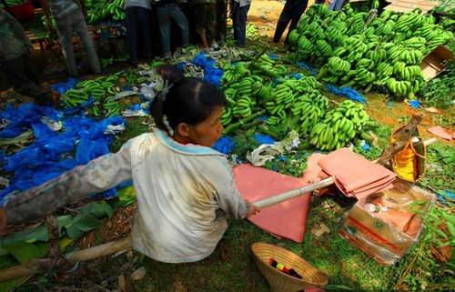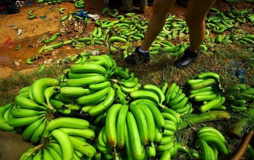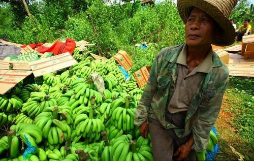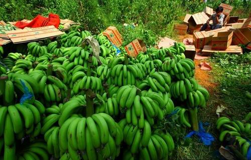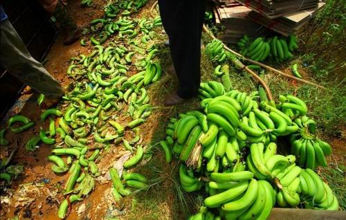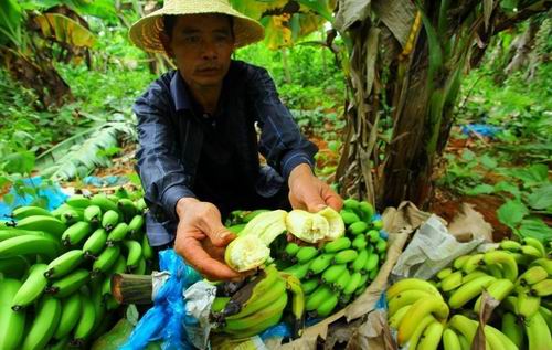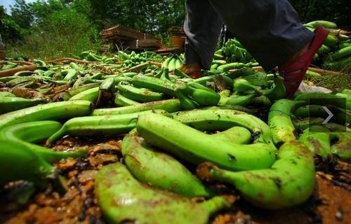 2011年7月10日,海南临高县南宝镇,一些蕉农在清洗香蕉,将成熟的香蕉丢弃在地或喂猪,未成熟的收割后等待买主。据了解,海南香蕉6月份收购价格下滑,临高南宝镇跌至每斤0.25元,远低于每斤0.8元生产成本价。至今,数十万斤香蕉滞销。据海南省农业厅分析,年初低温影响致海南“冬蕉”、“春蕉”迭加上市,两广及进口香蕉以及内地水果上市,“乙烯利事件”对消费者负面影响未消除是海南香蕉价格下跌、销售困难的三大原因。 (来源:东方IC)