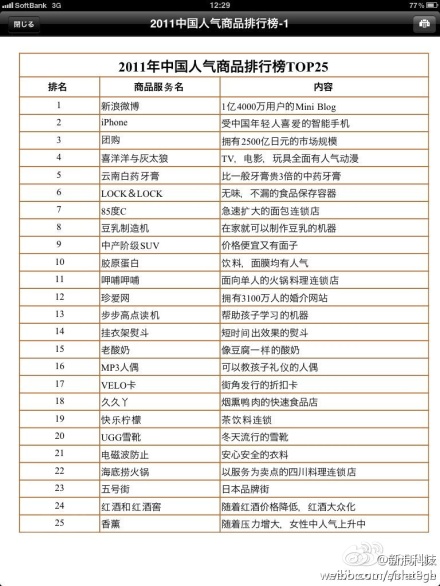 在榜单中,苹果iPhone和中国版Groupon“团购”分别排名第二和第三位,通过排名前三的这三种品牌可以得知,SNS在中国发展非常迅速。