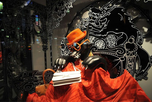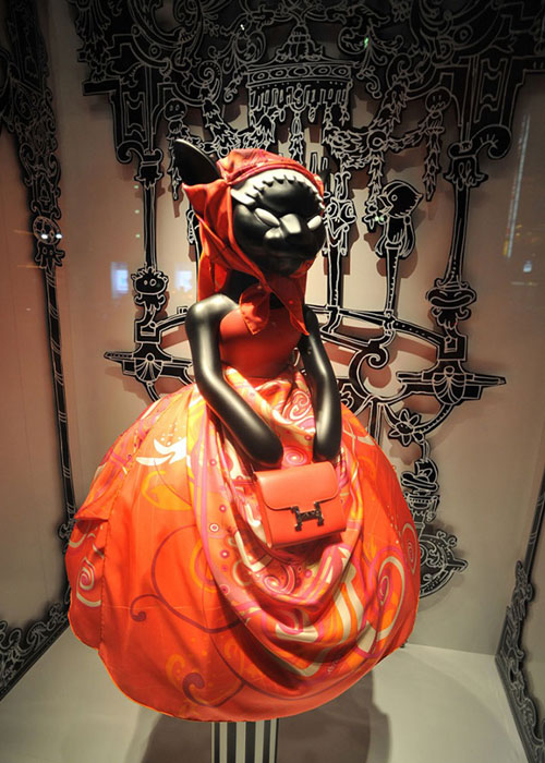 爱马仕(Hermes)位于东京银座的旗舰店为推广其围巾及手包产品,橱窗展示以“小红帽”为主题,但颠覆传统童话故事中的小红帽形象,通体黑色,造型邪恶,以凸显产品鲜艳的色彩;对应橱窗中的狼也同样淹没在围巾及手包中。 (来源:中国商业展示网)