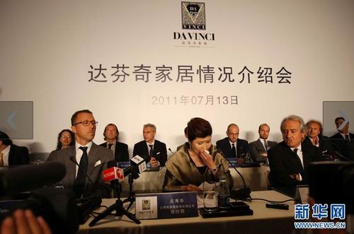 7月13日,达芬奇家居股份有限公司总经理潘庄秀华(中)出席情况介绍会。当日,达芬奇家居在北京召开情况介绍会,针对达芬奇家居涉嫌伪造产地、存在产品质量等问题作出回应。