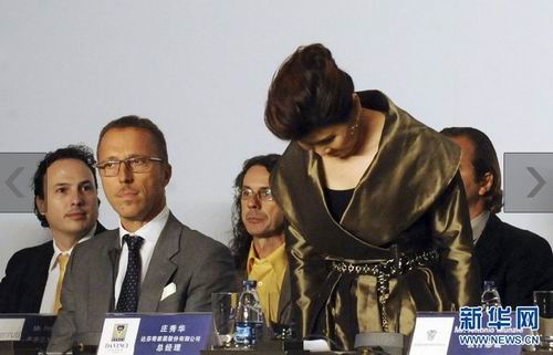 7月13日,在北京举行的达芬奇家居情况介绍会上,该公司总经理潘庄秀华(前右)为其情绪失控向媒体鞠躬致歉。