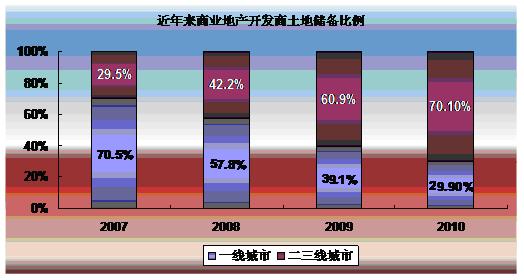 来自上海驰昂咨询(Sinotes)的一组数据显示:二三线城市商业地产正在进入高速发展期。近年来商业地产开发商一线城市土地储备和二三线城市土地储备的比例正悄悄发生变化。