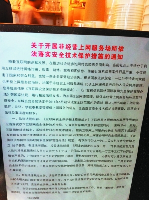该店内张贴的东城公安分局通知显示,当前社会利用互联网进行的违法行为日益严重,因此分局决定于6月1日在全区范围内的非经营上网服务场所落实安全技术保护设施建设。