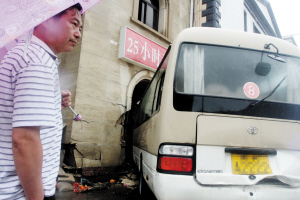 昨日上午9时20分许,一辆来自山西的旅游中巴突然从大连麒麟东路的坡上直冲下来,撞上了停在路边的一辆轿车和摩托车后,冲入一家暂停营业的便利店中。事故造成车上8人不同程度受伤。 (来源:新商报 记者:季禾子)