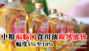 福临门所属的中粮集团相关负责人昨日表示,本月中下旬集团已对福临门大豆油、调和油等几大主力油品进行提价,提价幅度在5%至10%之间,提价通知已经发到全国各大超市。
