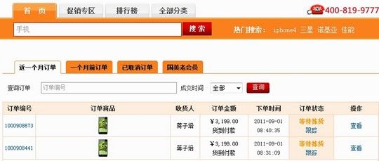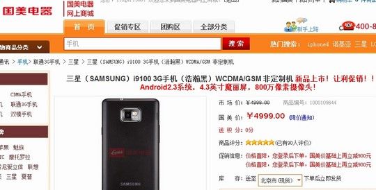 该网友向网易科技透露,今早8点,他和几名同事在国美网上商城发现,原价4999元的三星I9100手机的优惠介绍中出现了2次“购买减900”的优惠,这意味着3199元的价格比市面上要便宜1000多元,于是几人订购了八部,分开下单。而到了中午11点前后,登陆国美网上商城发现订单均被取消。