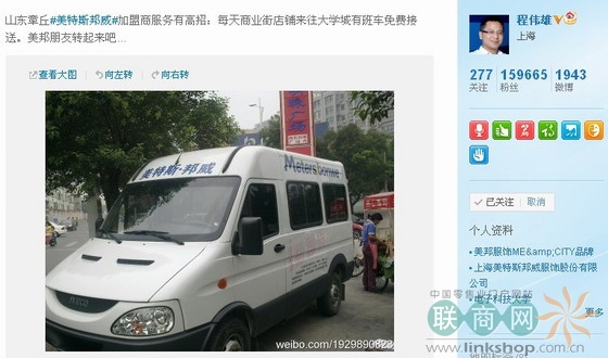 联商网消息:近日,美邦服饰ME&CITY品牌执行副总裁程伟雄在微博发布了一张照片(见图),称山东章丘的美特斯邦威加盟商服务有“高招”:每天有班车来往商业街店铺和大学城,免费接送顾客。据程伟雄介绍,县域市场有此等免费班车接送服务,在品牌加盟商当中还是别具匠心的,投入虽然大了,但消费者重复购买次数增加了。
