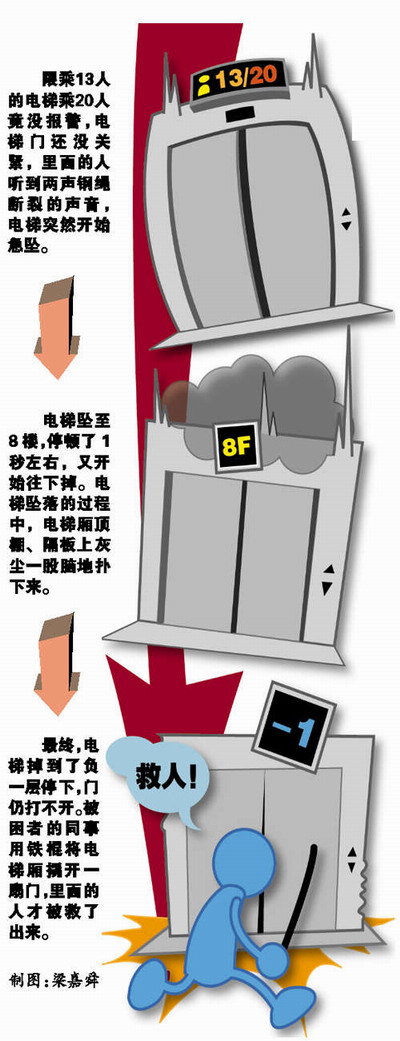 据亲历者说,电梯坠落时,里面还有很多人。当时东莞一建材公司的员工刚刚培训完,20人挤进限乘13人的电梯厢,电梯厢竟然没有报警,电梯门还没关紧,就听到两声钢绳断裂的声音,之后开始急坠。