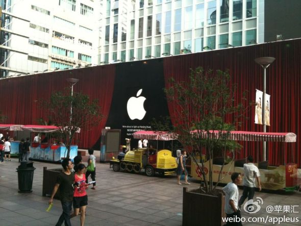上海南京东路的苹果Apple Store零售店今日公开“拉开帷幕”的图案,意味着该零售店开业在即。