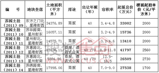 本次土地出让的苏园土挂(2011)13号地块,其中,容积率高达12.5-16.5,楼面起拍单价为2730元/平方米,土地起单价为45046.1元/平方米,主要用途是商服和酒店式公寓,40/70年产权。