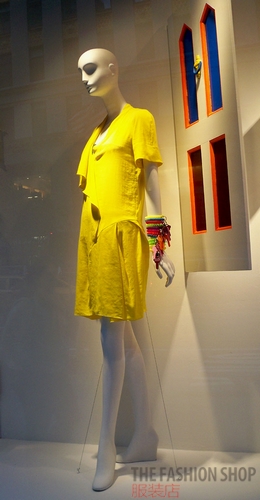 明黄色带给人高调、上扬的感觉,再加上展示模特配饰处的细节撞色,令这个橱窗更加高调喧哗。
