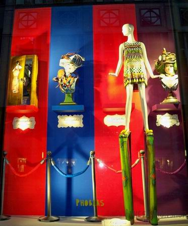 两个展示模特身着非常强烈的撞色服装,橱窗背景是非常多形式的艺术化作,颜色和概念上的多重混搭,这组橱窗想不高调都难。