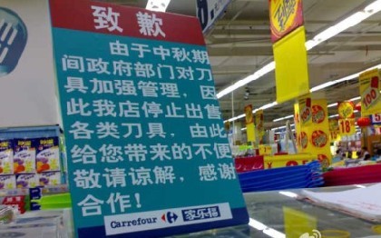 联商网消息:临近国庆,北京一些大型超市的菜刀全部下架。昨日,在家乐福、沃尔玛等超市发现,超市内的菜刀已全部下架。就连水果刀、裁纸刀等刀具也难寻踪迹。一名工作人员讲,临近国庆,他们接到上级命令,“十一”前和“十一”期间不得出售菜刀等刀具。