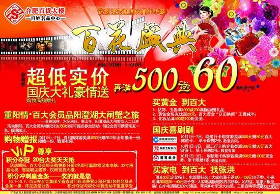 合肥百货大楼国庆大礼豪情送 满500送60超低实价