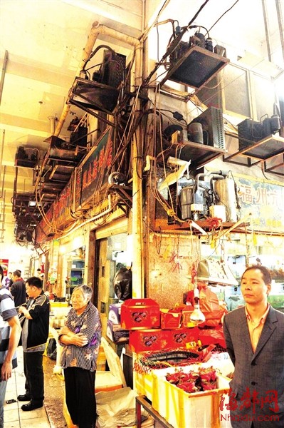 检查人员介绍,市场里几十家个体海鲜经营批发户,为了饲养待出售的活鱼、蟹、鲍鱼等海产品,需要大量的海水,于是有人专门从事海水营销,各店把海水放在蓄水池中,每日换水时大量的海水从地面自然排放,随意流淌,并向地下车库渗透。长期以来,高盐分的海水腐蚀一层楼板,消防管道等设施受腐蚀破坏严重。
