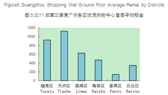 高力国际报告指出,随着多个大型零售商业的营业,零售商业间竞争更趋激烈;但由于良好的经济基本面和消费市场繁荣表现,广州市大型购物中心整体租金保持平稳,较上季度相比仍录得上升0.85%,至771.5元/平方米/月,同比上升6.34%。在天河区,高端零售品牌集中,商圈氛围成熟,租金较其它区表现突出,零售市场物业水平高于其余各区,其平均租金较上季度上升2.53个百分点,至1,117.4元/平方米/月,较去年同期上升7.5%;在越秀区,部分商场受交通、区域商业环境等因素限制,项目商业氛围有所削弱,业主为增强竞争力选择下调租金,如光明广场等。本季度该区零售物业整体平均租金较上季度持平,为919元/平方米/月。其余各区在租金方面基本保持稳定。2011年下半年仍有大量零售物业预期将推出市场,面对激烈的市场竞争,广州零售物业租金将面临下调压力。