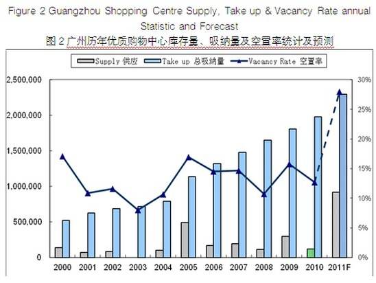 高力国际研究显示,本季度,广州白云区G5停机坪购物中心、天河体育中心商圈太古汇和珠江新城花城汇一区落成开业,为广州大型购物中心提供33万平方米新增供应,市场进入自2010年以来的供应高峰期,整体库存上升至2,651,150平方米。整体空置率上升1.5个百分点,至11.6%。由于需求强劲,刚入市的项目招商情况良好,如广州在丽柏广场后又一大高端零售项目太古汇目前整体招商率达100%, 而G5停机坪招商率达90%。