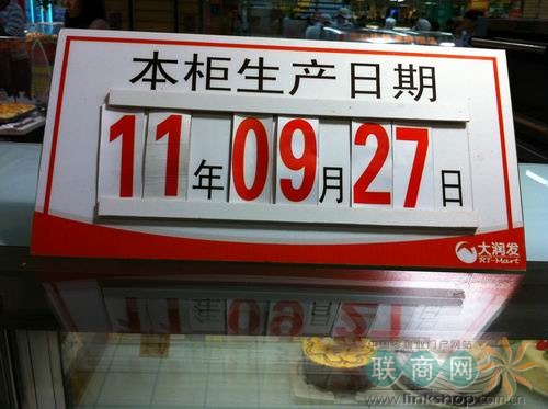图为:大润发卖场内“烘焙面包坊”商品的日期表。