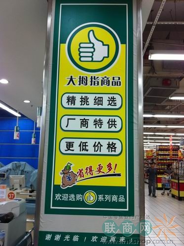 图为:大润发卖场内的自有品牌“大拇指”、“RT-Mart”的商品展示区。