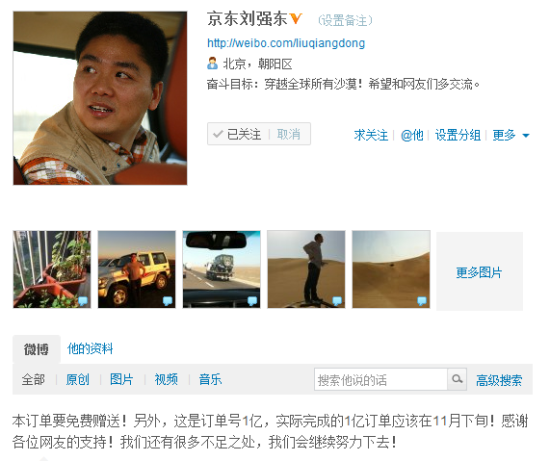 10月20日午间消息,京东商城CEO刘强东通过其新浪微博透露,随着一张从武汉库房发往长沙的订单送到用户手中,由京东商城自行采购、生产和配送的第1亿号订单完成。