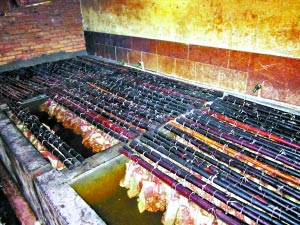 记者在黑窝点发现,这些猪肉的腌制过程触目惊心。十几个工人切猪肉的背后就是几个用水泥砖砌成的腌制猪肉的方槽。其中两个1米高、3米宽的方槽内,堆满腌制的猪肉。另外两个方槽内的猪肉,已被拿出来浸泡在水中,用来融化盐分。