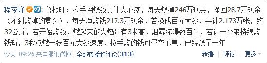 以至于分析人士鲁振旺感叹拉手网烧钱让人心疼,称拉手相当于每天烧掉246万现金,挣回28.7万现金(不到花掉的零头),每天净烧钱217.3万现金,若换成百元大钞,共计2.173万张,约32公斤。如果拉手网将这笔资金真的烧掉,燃起来的火焰足有3米高,烟雾弥漫数百米,若让小孩持续烧钱玩,3秒点燃一张百元大钞速度,拉手烧的钱可昼夜不息,已经烧了一年。