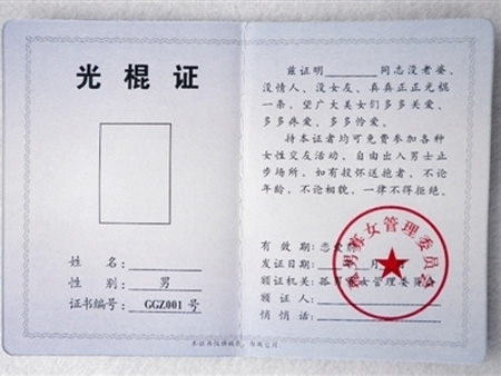 郑女士是温州某单位上班的一名职员,前几天,她通过网络购买了十几本光棍证,打算在光棍节当天给每个单身的同事送一本。“今年是巨型光棍节,单身的同事领取光棍证后打算好好庆祝一番,但我们同时也希望单身的同胞能早日‘脱光’,明年不再过这个节日。”